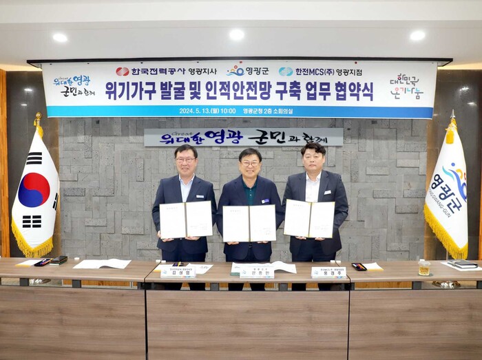[영광=장수영 기자] 전남 영광군이 최근 한국전력공사 영광지사 및 한전MCS(주) 영광지점과 위기가구 발굴 및 인적안전망 구축을 위해 민관협력 3자 업무협약을 체결했다.