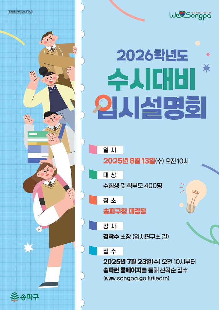 [시민일보 = 이대우 기자] 서울 송파구(구청장 서강석)가 오는 8월13일 오전 10시 송파구청 대강당에서 ‘2026학년도 수시 대비 입시설명회’를 개최한다.