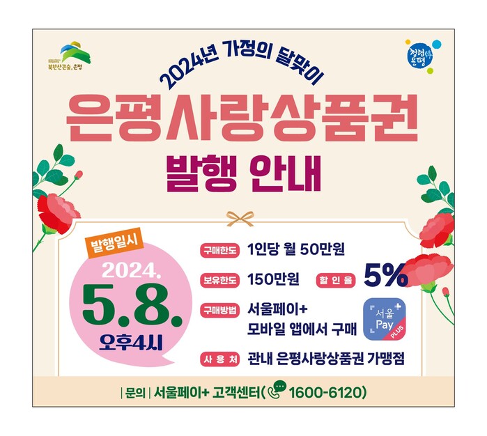 [시민일보 = 이대우 기자] 은평구(구청장 김미경)가 5월 가정의 달을 맞아 72억원 규모의 은평사랑상품권을 오는 8일에 5% 할인된 금액으로 판매한다.