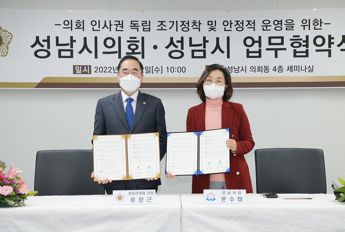[성남=오왕석 기자] 성남시의회(의장 윤창근)는 12일 지방자치법 전부개정에 따라 성남시의회와 성남시 간 지방의회 인사권 독립의 안정적인 추진을 위하여 업무협약을 체결했다고 밝혔다.