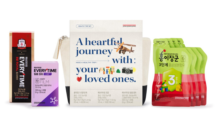 ‘정관장 헬시트립세트’는 여행지에서 간편하게 면역력과 피로를 관리할 수 있도록 ‘에브리타임로얄(10포)’, ‘홍이장군3단계로얄(4포)’, ‘에브리타임필름 컴피(20포)’으로 구성된 온 가족 건강 파우치다. ‘헬시트립세트골드’는 부모님 동반 여행 시 기력회복을 도울 수 있도록 ‘황진단(2환)’이 추가되었다.
