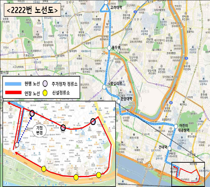 새롭게 정차하는 정류소는 추가되는 ▲자양미소약국·자양골목시장(2222번 기점 정류소로 변경 예정) ▲국민은행 자양지점 앞 ▲자양하늘채베르 아파트 앞과 자양강변길에 신설되는 ▲자양2동 주민센터 ▲구립 행복마루 어린이집 ▲자양한강도서관 정류소를 포함해 총 6곳이다.