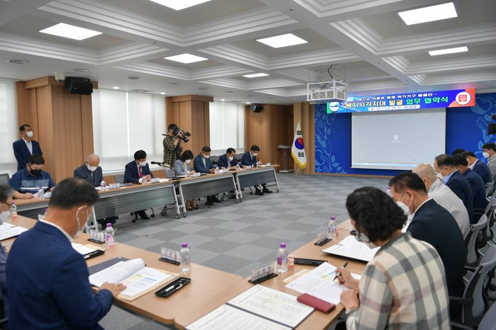 충남 예산군은 최근 복지사각지대 발굴을 위한 인적안전망을 강화하고자 생활업종 대표 및 신고의무기관 22개 기관이 참석한 가운데 ‘복지사각지대 발굴 업무 협약식’을 개최하고 예산군 의좋은형제 위기가구 발굴단을 출범했다. 사진은 이날 복지사각지대 발굴 업무 협약 체결식이 진행되고 있는 모습. (사진제공=예산군청)