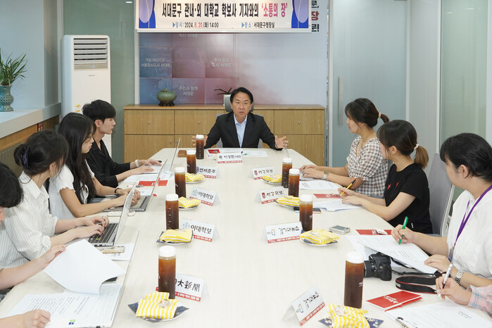 [시민일보 = 이대우 기자] 이성헌 서울 서대문구청장이 지난 20일 오후 구청 회의실에서 신촌글로벌대학문화축제와 청년정책, 신촌·이대 상권 활성화 등을 주제로 대학교 학보사 기자들과 간담회를 가졌다.