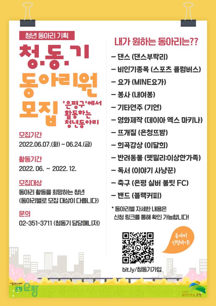 ‘청동기’사업에 참여하는 동아리는 ▲댄스(댄스부락리) ▲비인기 운동종목(SPORTS COLUMBUS) ▲요가(MINE요가) ▲봉사(내여봉-내일을 여는 봉사단) ▲기타연주(기연) ▲영화제작(데이아 엑스 마키나) ▲뜨개질(은청뜨밤-은평구 청년들의 뜨거운 뜨개질 밤) ▲희곡 감상(이달희-이달의 희곡) ▲반려동물 커뮤니티(펫밀리:이상한 가족) ▲독서(이야기 사냥꾼) ▲축구(은평 실버 불릿 FC) ▲밴드(블랙커피) 등 12개 동아리이며, 올해 말까지 은평구 지역을 중심으로 활발한 활동을 하게 된다. 연말에는 성과공유회를 겸한 동아리 박람회도 개최할 예정이다.