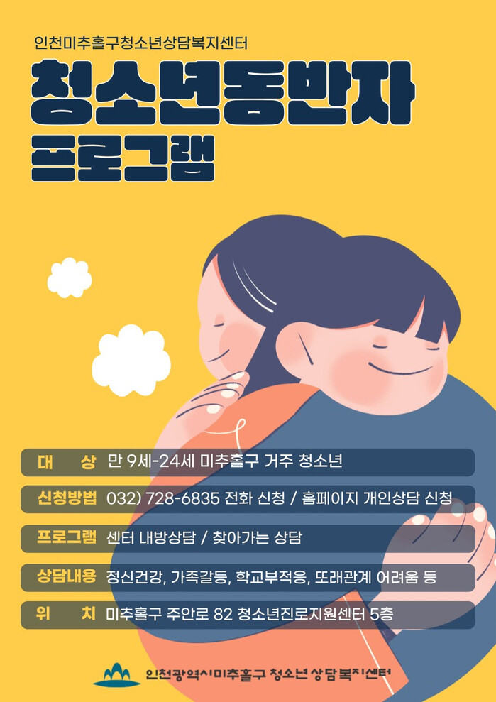 [인천=문찬식 기자] 인천 미추홀구청소년상담복지센터(센터장 최문주, 이하 센터)는 22일 지역 내 청소년을 대상으로 찾아가는 상담을 지원하는 ‘2024년 청소년동반자 프로그램’을 연중 무료로 운영한다고 밝혔다.