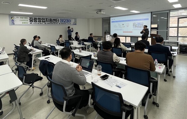 | ▲ 중랑창업센터에 입주한 기업들이 투자자를 대상으로 투자유치 발표를 진행하는 ‘데모데이’ 행사가 진행되고 있다. (사진=중랑구청 제공) |
