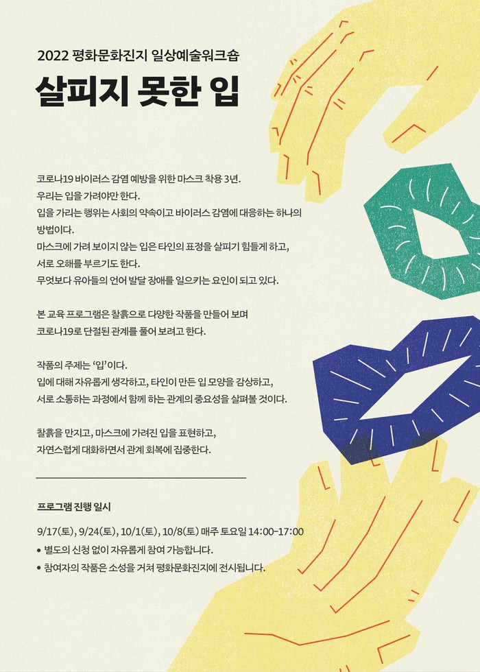 ‘살피지 못한 입’은 평화문화진지 야외에서 오는 17일 토요일, 24일 토요일, 10월1일 토요일, 10월8일 토요일 오후 2시에 무료로 진행된다. 참여를 원하는 누구나 현장에서 바로 참여할 수 있다.