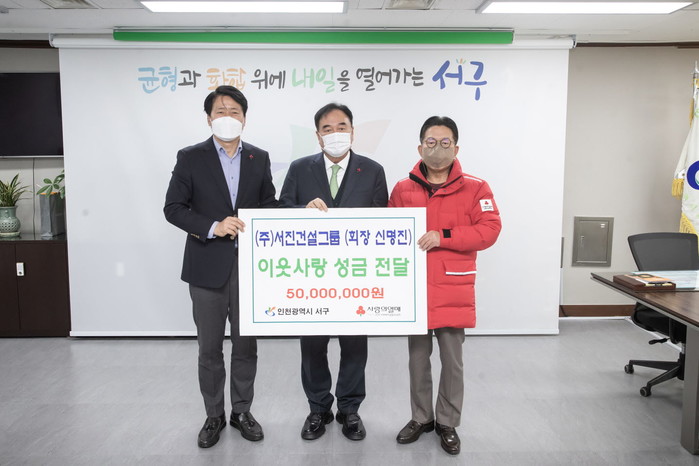[인천=문찬식 기자] 인천 서구가 최근 (주)서진건설그룹이 어려운 이웃들을 위한 성금 5000만원을 전달했다고 밝혔다.
