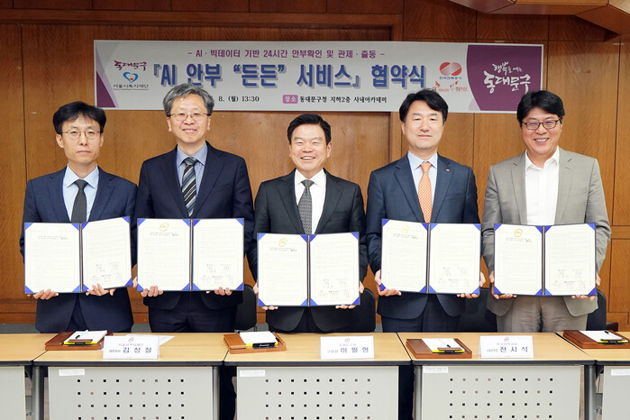 | ▲ 이필형 구청장(가운데)이 지난 8일 ‘AI 안부든든 서비스’ 업무협약을 체결한 뒤 (왼쪽부터) 최낙훈 SK텔레콤 Industrial AIX CO장, 김상철 서울시 복지재단 대표이사, 전시식 한국전력공사 서울본부장, 이준호 행복커넥트 이사장과 기념촬영을 하고 있다. (사진=동대문구청 제공) |