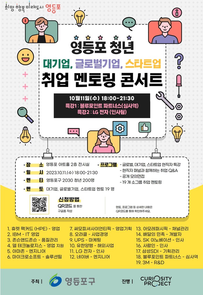 이번 행사에는 ▲네이버, LG전자 등 국내 대기업(7개) ▲3M, UPS 등 외국계 기업(10개) ▲블루포인트파트너스 등 유명 스타트업(2개)에 이르는 총 19개 기업, 멘토 19명(기업별 1명)이 청년들을 기다린다.