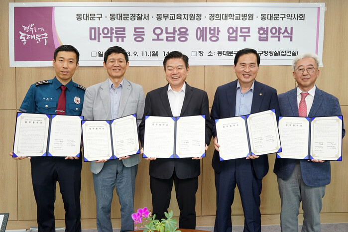 [시민일보 = 이대우 기자] 서울 동대문구(구청장 이필형)는 최근 동대문경찰서, 동부교육지원청, 경희대학교병원, 동대문구약사회와 마약류 등 오남용 예방 시스템 구축을 위한 업무협약을 체결했다.