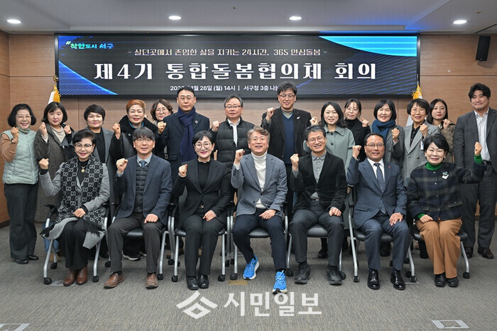[광주=정찬남 기자] 김이강 광주 서구청장(앞줄 가운데)이 26일 서구청 나눔홀에서 열린 ‘제4기 통합돌봄협의체 회의’에서 참석자들과 기념촬영을 하고 있다. 광주 서구 제공