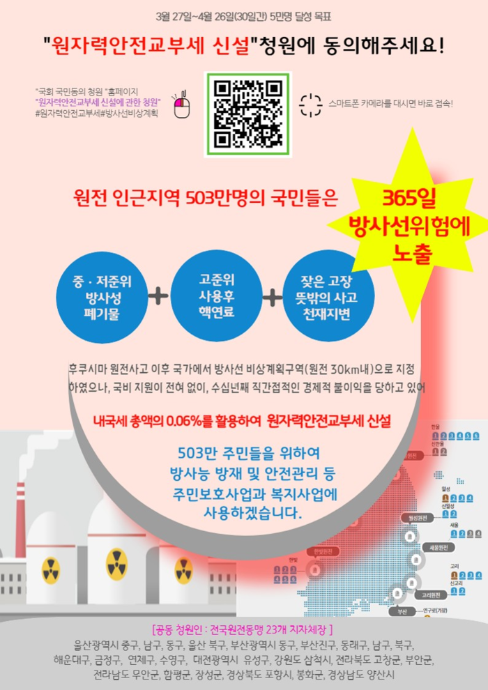청원 동의 참여 방법은 국회 국민동의 청원 누리집(https://petitions.assembly.go.kr)이나 홍보물 QR코드에 접속하여 ‘원자력안전교부세 신설에 관한 청원’을 선택하고 본인인증 후 동의하면 된다.