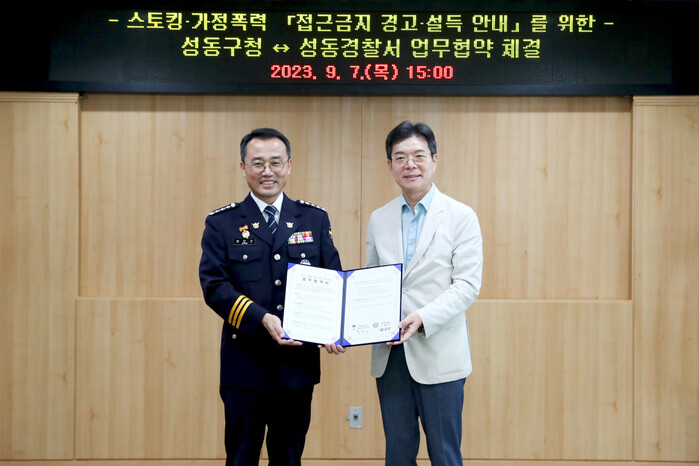 [시민일보 = 홍덕표 기자] 성동구(구청장 정원오)가 최근 성동경찰서와 협약을 체결하고 스토킹, 가정폭력 등 범죄 피해자를 보호하기 위해 '가해자 접근금지 경고·설득 안내' 사업을 추진한다.