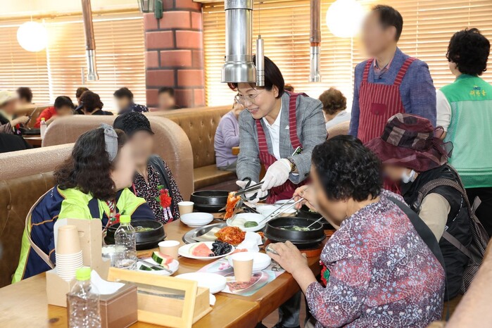 | ▲ 응암1동, ‘제52회 어버이날 경로잔치’에 참석해 어르신께 식사를 올리는 김미경 은평구청장 (사진=은평구청 제공) |
