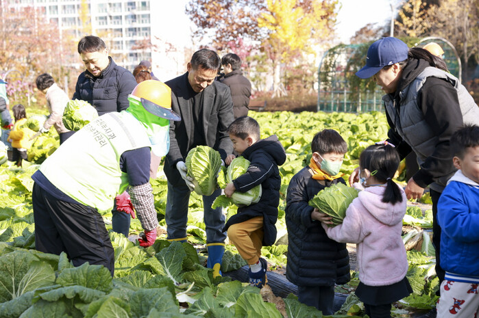 이번 행사에는 지역내 보육시설 원아 등 약 100명이 참석한 가운데, 약 3개월의 재배기간을 거쳐 자란 배추와 무를 어린이들과 함께 수확하고 배추김치와 깍두기를 담가보는 김장 체험의 시간을 가졌다.