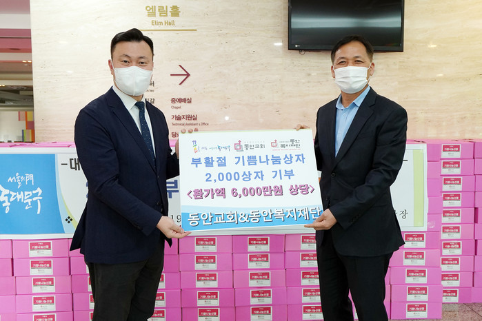 서울 동대문구는 이문1동에 위치한 대한예수교장로회 동안교회로부터 19일 지역내 어려운 이웃을 위한 다양한 식료품이 담긴 기쁨나눔상자 2000개(환가액 6000만원)를 기탁받았다. 사진은 이날 전달식에서 관계자들이 기념촬영을 하는 모습. (사진제공=동대문구청)