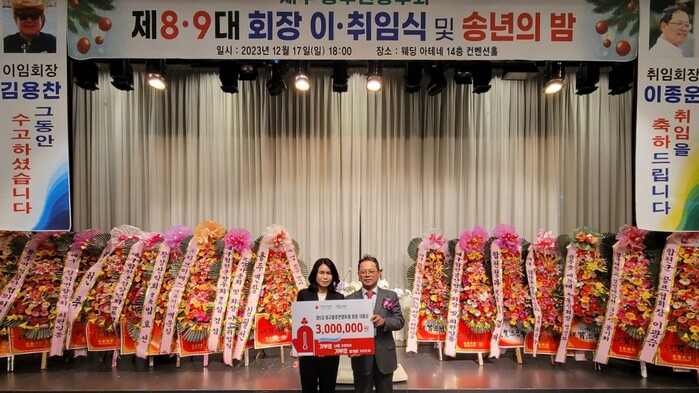 이종운 회장은 “취임하는 이 뜻 깊은 자리에 많은 분들이 참석해 주셔서 너무 감사드리며, 넘치는 사랑을 지역 사회에 보답하고자 내 고향 용주면의 어려운 가구에 작은 정성이지만 보탬이 되고자 성금을 전하게 됐다”며 “앞으로도 꾸준한 나눔 활동을 통해 지역사회 복지 증진에 최선을 다하겠다”고 말했다.