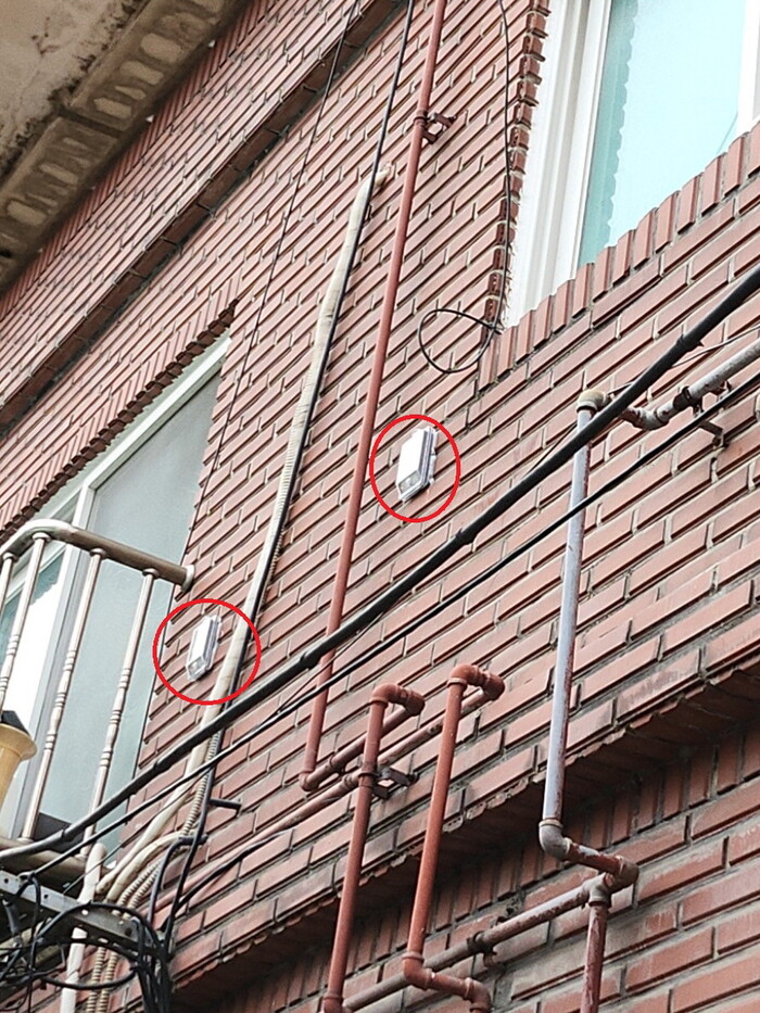 | ▲ 공동주택 가스배관 옆 건물 외벽에 설치한 침입감지장치. (사진=강북구청 제공) |