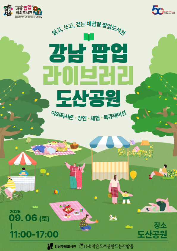 도산공원에서 진행되는 강남팝업라이브러리는 강남구립도서관 5개 권역 중 논현권역 4개 도서관(논현, 논현문화마루, 정다운, 청담)이 협력하여 운영하며, 10월 중에는 대치권역도서관 협력프로그램으로 ’강남라이브러리 양채천 산책‘을 준비하고 있다.