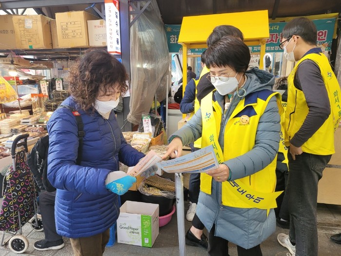 경기 수원시 팔달구 화서1동 지역사회보장협의체가 7일 화서시장에서 '당신의 우산이 되어드리겠습니다'라는 캐치프레이즈 아래 복지사각지대 및 자원 발굴 캠페인을 전개했다. 사진은 이날 협의체 관계자들이 시장을 이용하는 주민들에게 홍보용 우산 및 복지 관련 리플릿을 배부하고 있는 모습. (사진제공=팔달구청)