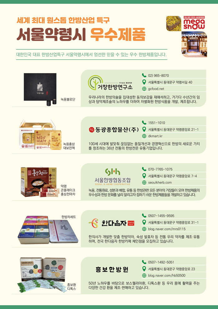 이번 박람회에는 ▲거창한방연구소 ▲(주)동광종합물산 ▲서울한방협동조합 ▲한다음자 ▲흥보한방원 등 서울약령시를 대표하는 업체들이 참여해 품평회를 거쳐 선발된 고품질 한방제품을 소개할 예정이다.