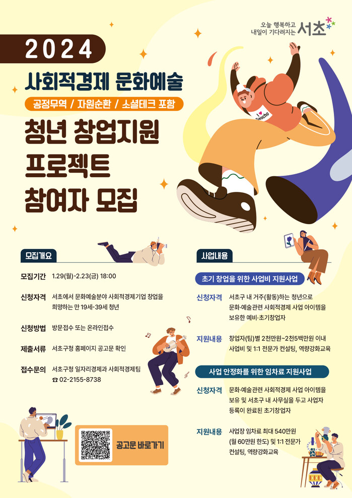 [시민일보 = 이대우 기자] 서초구(구청장 전성수)가 ‘사회적경제 문화예술 청년 창업지원 프로젝트’ 참여자 모집에 나섰다.