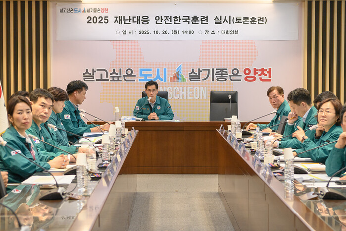 양천구가 지난 20일 서울에너지공사에서 ‘2025년 재난대응 안전한국훈련’을 진행했다. 구청과 양천소방서가 공동 주관한 이번 훈련에는 구 재난안전대책본부, 통합지원본부, 긴급구조통제단 등 유관기관과 응급의료팀, 주민 및 국민체험단 등 100여명이 참여했다. 사진은 이기재 구청장(가운데)이 대책회의를 주재하는 모습. (사진=양천구청 제공)