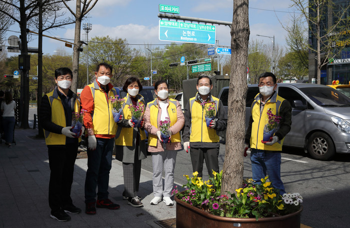 서울 강남구 개포4동 주민센터는 지난 11일 개포로에 ‘꽃기둥걸이 및 포인트 화단’을 조성해 희망의 메시지를 전달하고자 화단을 조성하고, 주민이 함께 걷고 싶은 ‘꽃의 거리’를 조성했다. 사진은 이날 참여한 봉사자들이 기념촬영을 하는 모습. (사진제공=강남구청)