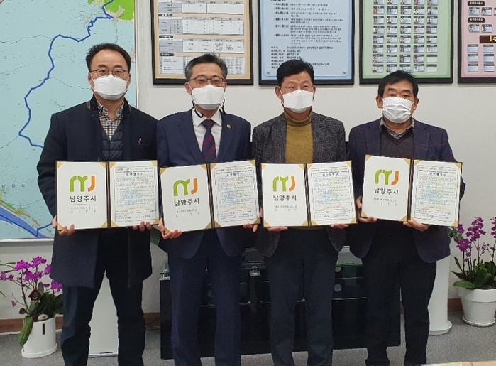 경기 남양주시 사회복지관 남부희망케어센터는 지난 14일 법무법인 현담, 와부조안행정복지센터, 와부읍 지역사회보장협의체와 함께 와부읍 취약계층에 대한 무료 법률 서비스 제공, 지역주민의 복지 증진에 대한 지원 협력과 관련된 다자간 업무협약을 체결했다. 사진은 협약식에서 관계자들이 기념촬영을 하는 모습. (사진제공=남양주시청)
