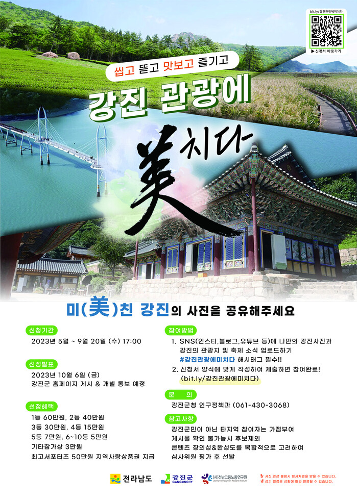 또 SNS 서포터즈를 ‘강진 관광에 미치다’라는 주제로 오는 20일까지 강진 관광에 관심이 많은 관광객들을 대상으로 강진의 아름다움과 개성을 홍보하고 다양한 콘텐츠로 강진 관광 SNS의 활성화를 도모하기위해 서포터즈를 모집한다.