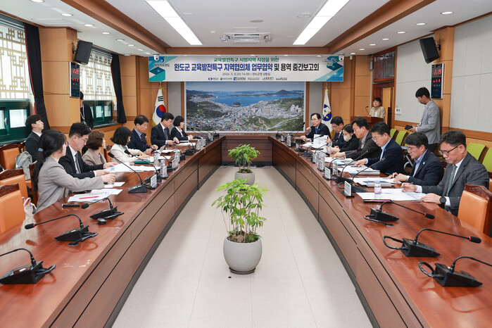 [완도=김우정 기자] 전남 완도군은 최근 군청 상황실에서 교육발전특구 시범지역 지정을 위한 지역 협의체와 업무 협약 및 용역 중간 보고회를 개최했다.