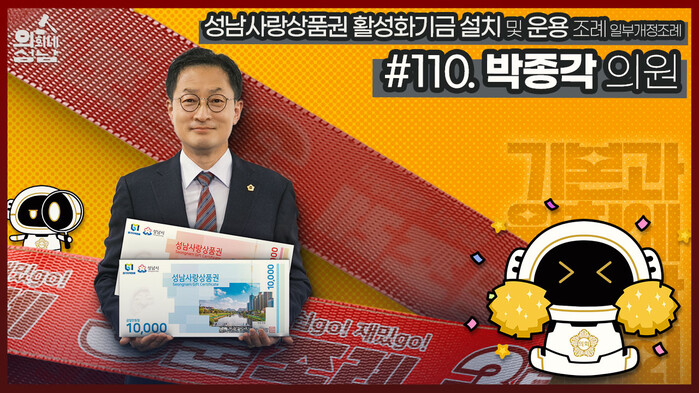 이번에 소개된 조례는 박종각 의원 등 15명이 발의한 ‘성남사랑상품권 활성화기금 설치 및 운용 조례 일부개정조례’이다. 이 조례는 성남사랑상품권을 효율적으로 관리함으로써 성남시 소상공인과 전통시장을 지원하고 지역경제를 활성화하기 위해 개정되었다. 이번 조례 개정을 통해 유효기간 내에 사용되지 않고 남은 상품권 금액과 운용 과정에서 발생하는 이자를 성남사랑상품권 활성화기금으로 편입하도록 명시함으로써 52억에 달하는 금액을 기금에 귀속시켜 관내 소상공인과 지역경제를 위해 활용할 수 있도록 하였다. 이 조례는 2023년 10월 10일부터 시행 중이다.