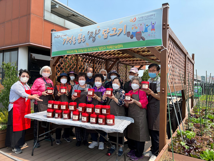 | ▲ 지난 20일 진행된 '장 담그기' 행사에서 치매 노인 및 가족이 장을 담근 후 기념촬영을 하고 있는 모습. (사진제공=양천구청) |