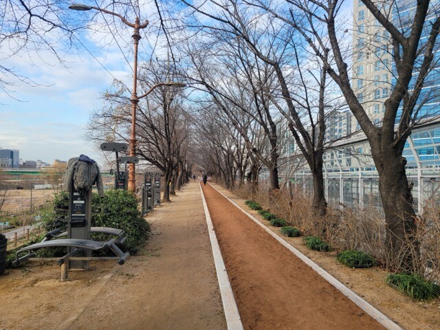 | ▲ 각종 야외 운동기구와 함께 운동을 할 수 있는 안양천 맨발 황톳길. (사진=영등포구청 제공) |