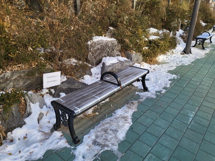 그러나 겨울철에는 추운 날씨 등으로 인해 벤치에 앉아 쉬는 데 어려움이 있었고, 이에 구는 '벤치 상부 방수 보온덮개'를 설치했다.
