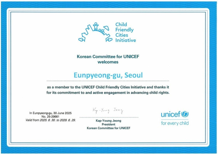[시민일보 = 이대우 기자] 은평구(구청장 김미경)가 최근 유니세프 한국위원회로부터 아동친화도시 상위단계 인증을 획득했다고 15일 밝혔다.