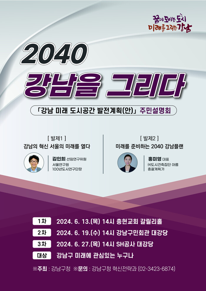 ‘강남 미래 도시공간 발전계획 수립 용역’의 일환으로 진행되는 이번 주민설명회는 ▲13일 오후 2시 충현교회 갈릴리홀 ▲19일 오후 2시 강남구민회관 대강당 ▲27일 오후 2시 서울주택도시공사(SH) 대강당에서 진행되며, 강남구의 미래에 대해 관심 있는 사람이면 누구든 참석할 수 있다.