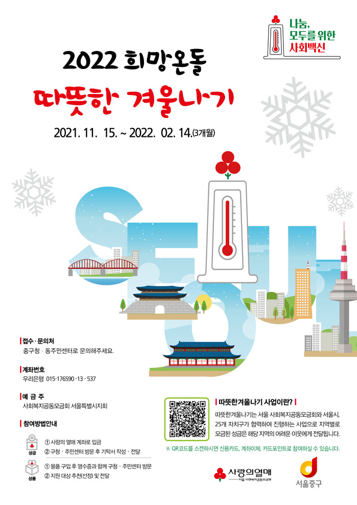 [시민일보 = 여영준 기자] 서울 중구(구청장 서양호)는 '2022 희망온돌 따뜻한 겨울나기 사업'을 추진한다고 24일 밝혔다.