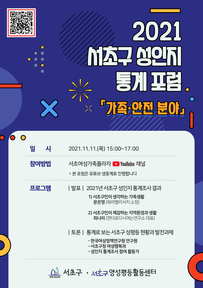 서초구양성평등활동센터가 주최하는 이번 포럼은 ‘2021년 서초구 성인지 통계조사 결과-가족과 안전분야 ’를 주제로 조사 결과 발표 및 민관학계 전문가, 활동가들이 자리해 서초구에 필요한 성평등 사업과 성평등 발전을 위해 다각적인 토론을 진행할 예정이다.