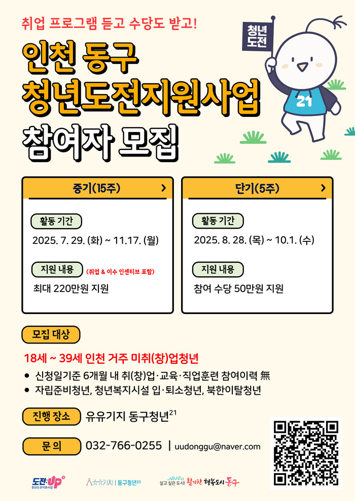 [인천=문찬식 기자] 인천 동구(구청장 김찬진)는 구직단념청년을 대상으로 청년도전지원사업 하반기 참여자를 오는 8월 28일까지 모집한다고 밝혔다.