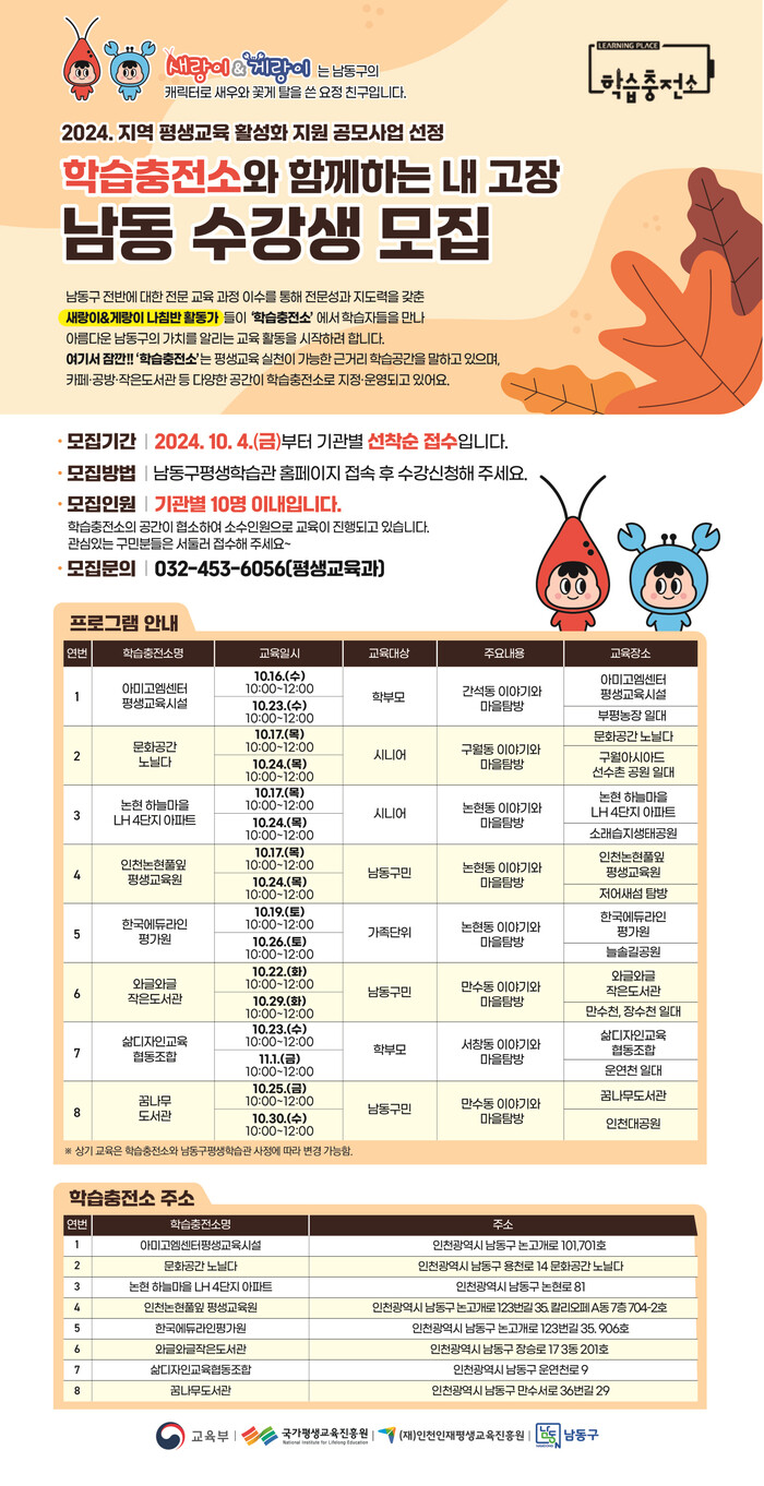 신청은 남동구평생학습관 홈페이지를 통해 선착순 접수로 진행되며, 남동구민 누구나 신청할 수 있다.