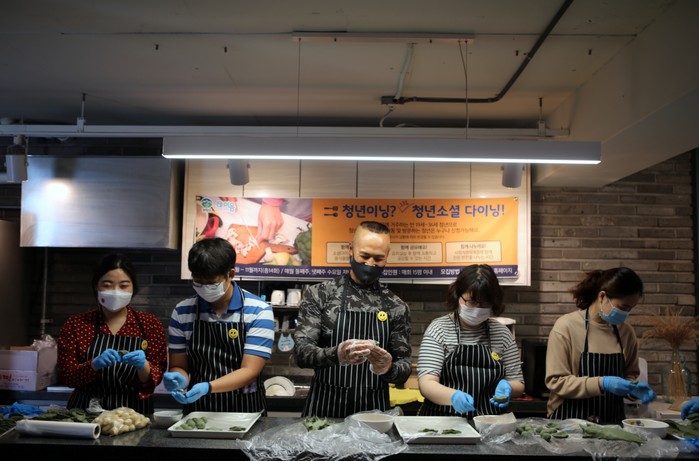 | ▲지난해 청년소셜 다이닝에 참가한 참가자들이 함께 송편을 빚고 있다.(사진제공=관악구청) |