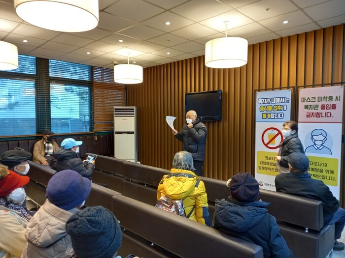 | ▲ 떳다방 등 허위 과대광고로 인한 피해 사례를 예방하기 위해 어르신들을 대상으로 홍보 활동을 펼치고 있는 모습. (사진=중랑구청 제공) |