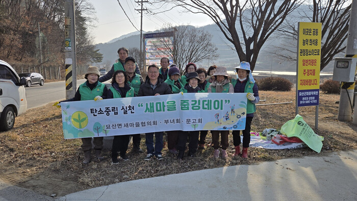 이번 정화 활동은 설맞이 깨끗한 묘산면을 가꾸기 위해 해마다 실천하는 행사이며 새마을협의회 회원 및 부녀회원 20여 명이 참여했다.