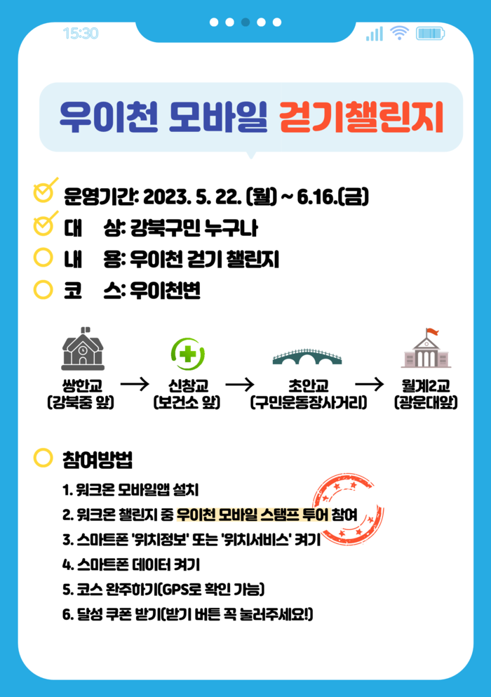 챌린지 참여 희망자는 스마트폰에 걷기 앱 워크온을 설치한 후 '우이천 모바일 걷기 챌린지'를 눌러 동참하면 된다.