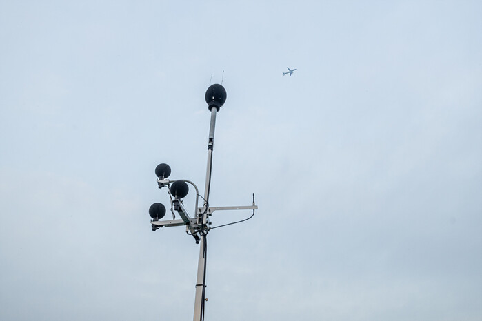| ▲ 양천구 공항소음 자동측정기 위로 항공기가 지나가는 모습. (사진=양천구청 제공) |