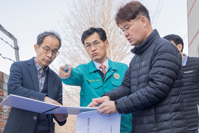 | ▲ 지역내 옹벽 보강공사현장을 찾아 현장점검 중인 이기재 구청장. (사진=양천구청 제공) |