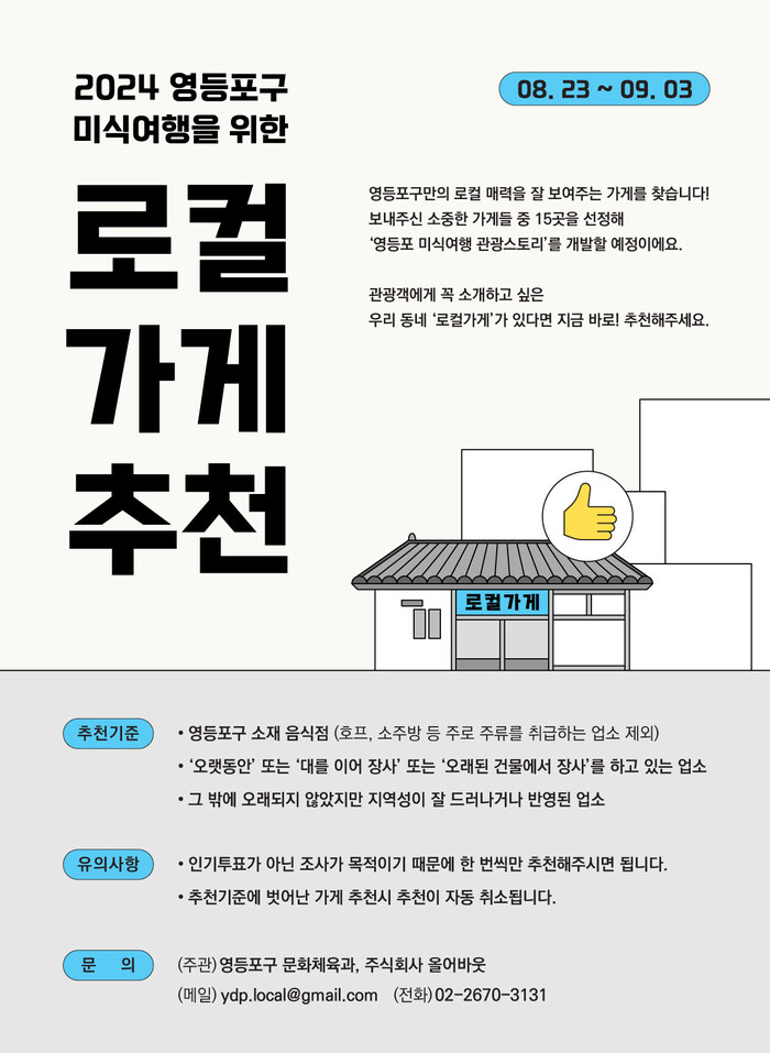 구는 오는 9월3일까지 구 누리집을 통해 이야기가 있는 ‘로컬가게’를 추천받고 있다. 영등포에서 대를 이어 장사하거나 오래된 건물에서 영업하고 있는 음식점, 오래되지 않았지만 지역성이 잘 드러난 음식점이라면 가능하다.